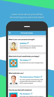 Download our free app to discover your personality traits, motivations, interests at work, emotional intelligence, ways of dealing with emotions and stress, and more!